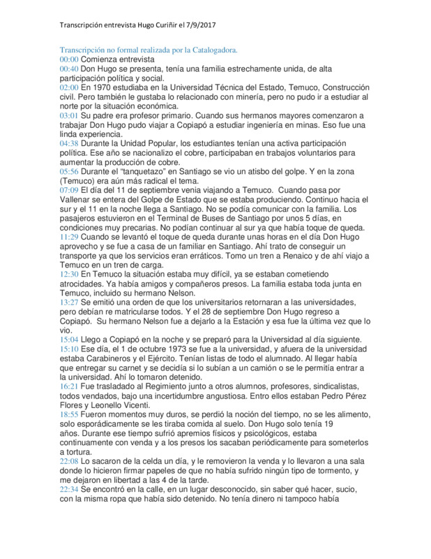 Hugo Curiñir Lincoqueo, relata su experiencia. Cuenta acerca de sus estudios en Temuco para luego decidir irse a Copiapo a estudiar Ingeniería en Minas, durante el Gobierno de la Unidad Popular. Relata la experiencia del Golpe de Estado, que lo encuentra mientras venia viajando de Copiapo a Temuco a ver a su familia. En ese trayecto queda virtualmente detenido en el terminal de buses. Luego llega a Temuco donde se entera de los efectos del Golpe entre sus cercanos. Vuelve a Copiapo a continuar sus estudios. Es la ultima vez que ve a su hermano Nelson con vida. En Copiapo a la llegada a la Universidad lo detienen junto a muchos otros estudiantes y profesores, Son llevados a diferentes lugares de detencion donde sufren torturas y malos tratos. Luego es dejado libre y vuelve a Temuco. En Temuco se entera que su hermano Nelson ha sido detenido y esta desaparecido. Su madre es un ejemplo de trabajo incansable por lograr saber la verdad y recuperar a su hijo. Luego Hugo debe abandonar el pais por su seguiridad y viaja a Bahía Blanca donde estaba su otro hermano. Alli sigue estudiando pero los cambios politicos en Argentinan impiden que continuen. Alli conoce a Victor Oliva Troncoso, un estudiuante temuiquense que luego es aseinado en Bahia Blanca. Hugo Curiñir viaja a Rosario, y finalmente vuelve a Temuco en 1982, donde la situacion economica es muy dura. Su madre y toda la familia continuan buscandoa Nelson. En 1991 gracias a la persistencia incansable de su madre, encuentran el cuerpo de Nelson en el cementerio de Imperial a quien finalmente pueden darle una sepultura digna. La entrevista dura 73 minutos y se realiza el 7 septiembre 2017. Esta entrevista forma parte del proyecto "Memorias del Sur", del Centro de Estudio y Promoción de los Derechos Humanos, Universidad de la Frontera, Temuco, Chile.