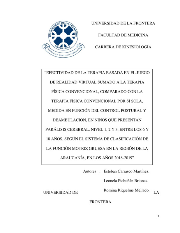 Efectividad de la terapia basada en el juego de realidad virtual sumado a la terapia física convencional, comparado con la terapia física convencional por sí sola, medida en función del control postural y deambulación, en niños que presentan parálisis cerebral nivel 1, 2 y 3, entre los 6 y 18 años, según el sistema de clasificación de la función motriz gruesa en la región de La Araucanía, en los años 2018-2019