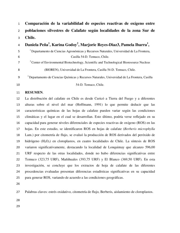 Comparación de la variabilidad de especies reactivas de oxígeno entre 1 poblaciones silvestres de Calafate según localidades de la zona Sur de 2 Chile.