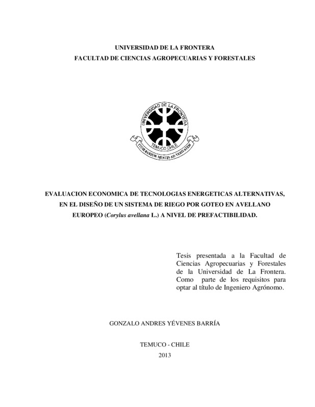 Evaluacion económica de tecnologías energeticas alternativas, en el diseño de un sistema de riego por goteo en avellano europeo (Corylus avellano L.) a nivel de prefactibilidad
