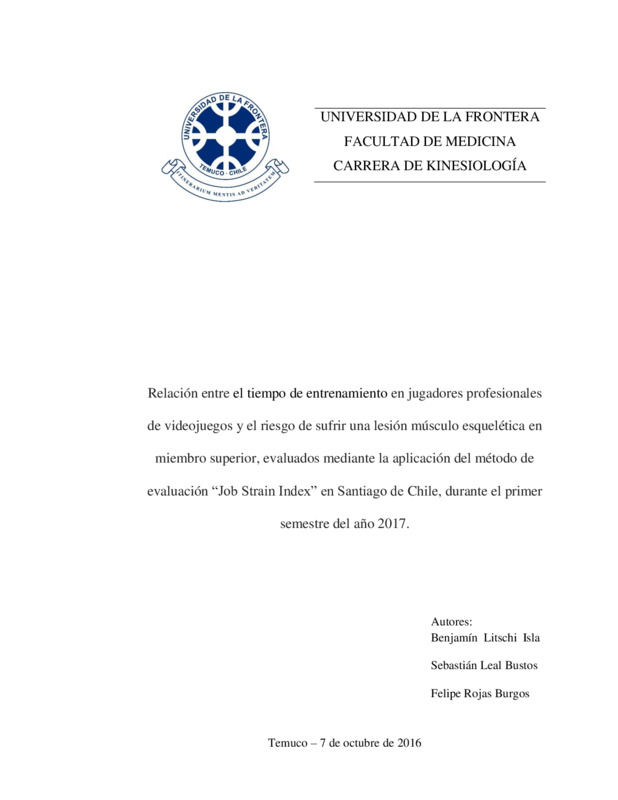 Relación entre el tiempo de entrenamiento en jugadores profesionales de videojuegos y el riesgo de sufrir una lesión músculo esquelética en miembro superior, evaluados mediante la aplicación del método de evaluación Job Strain Index en Santiago de Chile, durante el primer semestre del año 2017