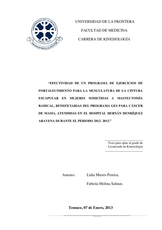 Efectividad de un programa de ejercicios de fortalecimiento para la musculatura de la cintura escapular en mujeres, sometidas a mastectomía radical, beneficiarias del programa Ges para cáncer de mama, atendidas en el Hospital Hernán Henríquez Aravena durante el periodo 2012-2013