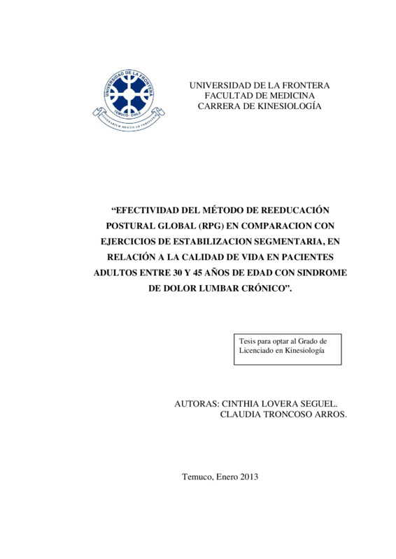 Efectividad del método de reeducación postural global (RPG) en comparación con ejercicios de estabilización segmentaria, en relación a la calidad de vida en pacientes adultos entre 30 y 45 años de edad con síndrome de dolor lumbar crónico