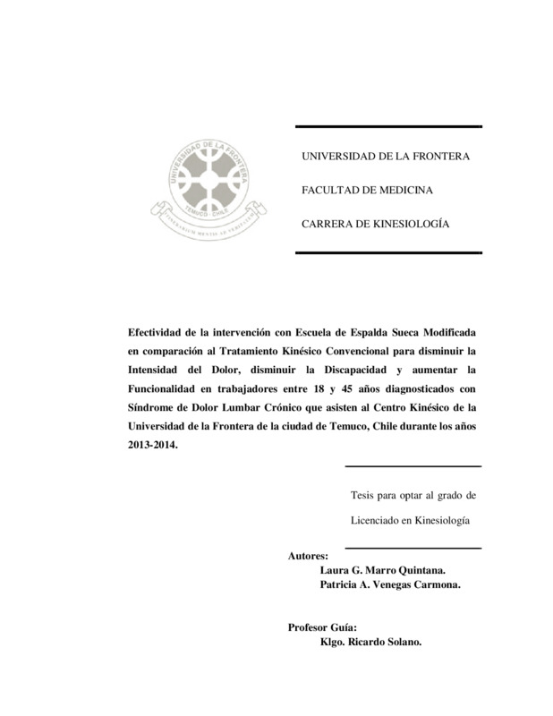 Efectividad de la intervención con Escuela de Espalda Sueca Modificada en comparación al Tratamiento Kinésico Convencional para disminuir la intensidad del dolor, disminuir la discapacidad y aumentar la funcionalidad en trabajadores entre 18 y 45 años diagnosticados con Síndrome de Dolor Lumbar Crónico que asisten al Centro Kinésico de la Universidad de La Frontera de la ciudad de Temuco, Chile durante los años 2013-2014