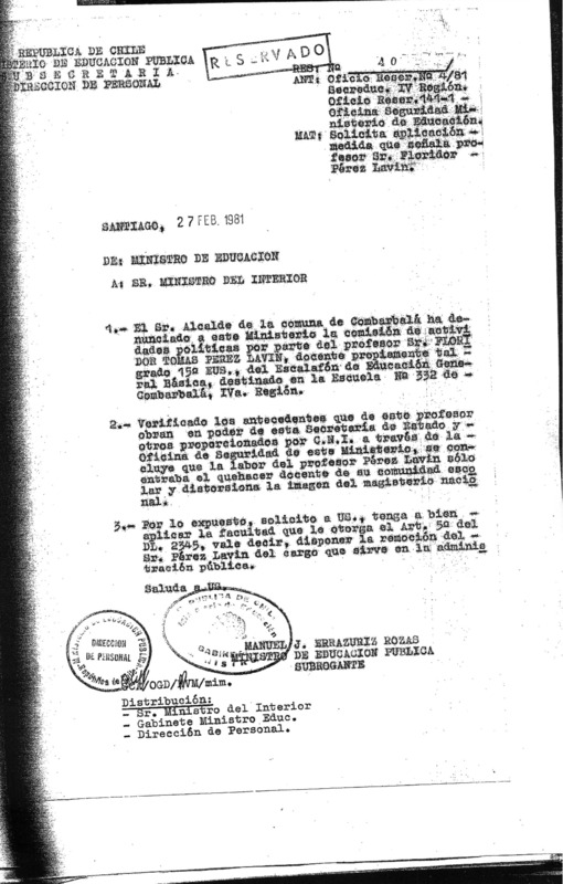 Exoneración del profesor de Combarbalá, Floridor Pérez Lavín